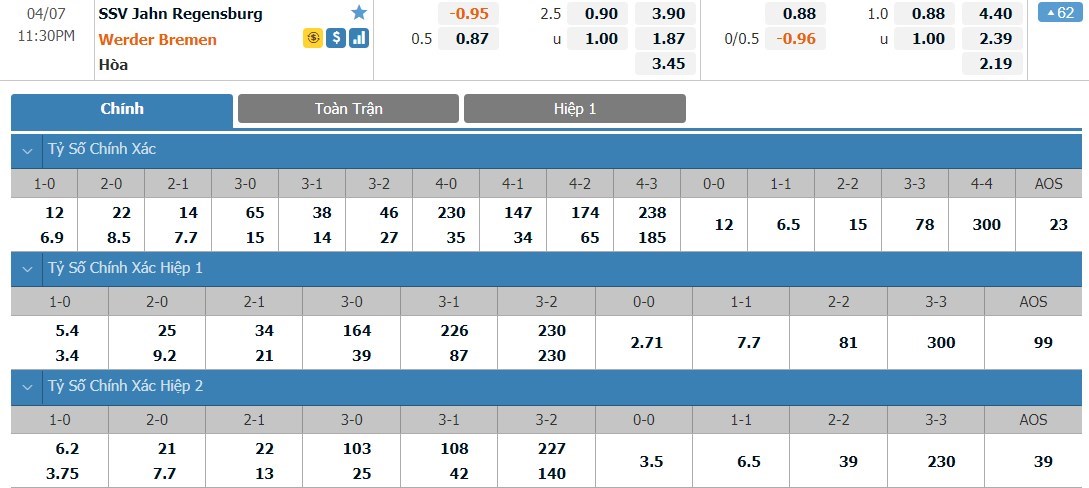Tỷ lệ kèo cá cược bóng đá trực tuyến trận Jahn Regensburg vs Werder Bremen