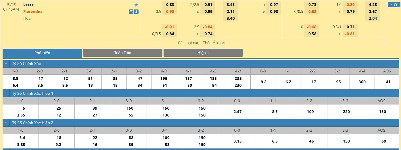 Xem tỷ lệ kèo cá cược bóng đá trực tuyến Lecce vs Fiorentina