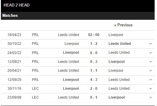 Thống kê đối đầu Leeds United vs Liverpool