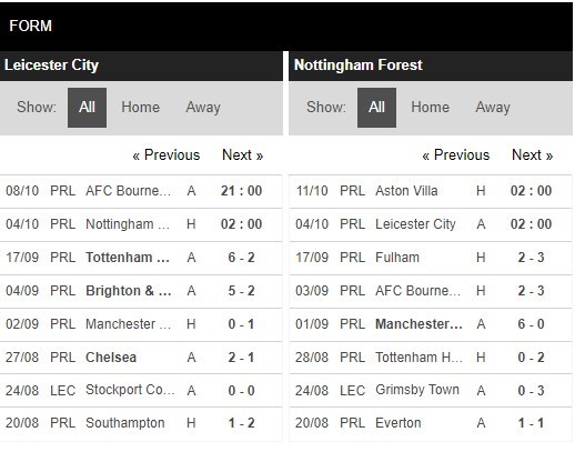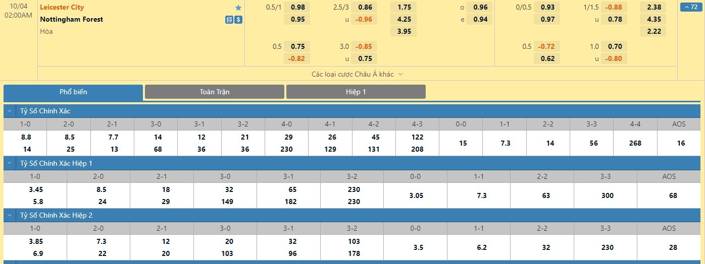 Xem tỷ lệ kèo cá cược bóng đá trực tuyến Leicester City vs Nottingham