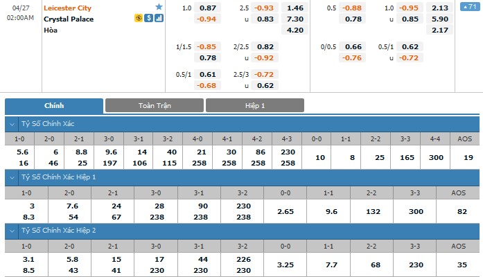 Xem tỉ lệ kèo cá cược bóng đá trực tuyến Leicester vs Crystal Palace
