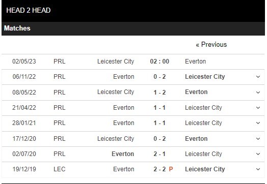 Thống kê đối đầu Leicester vs Everton