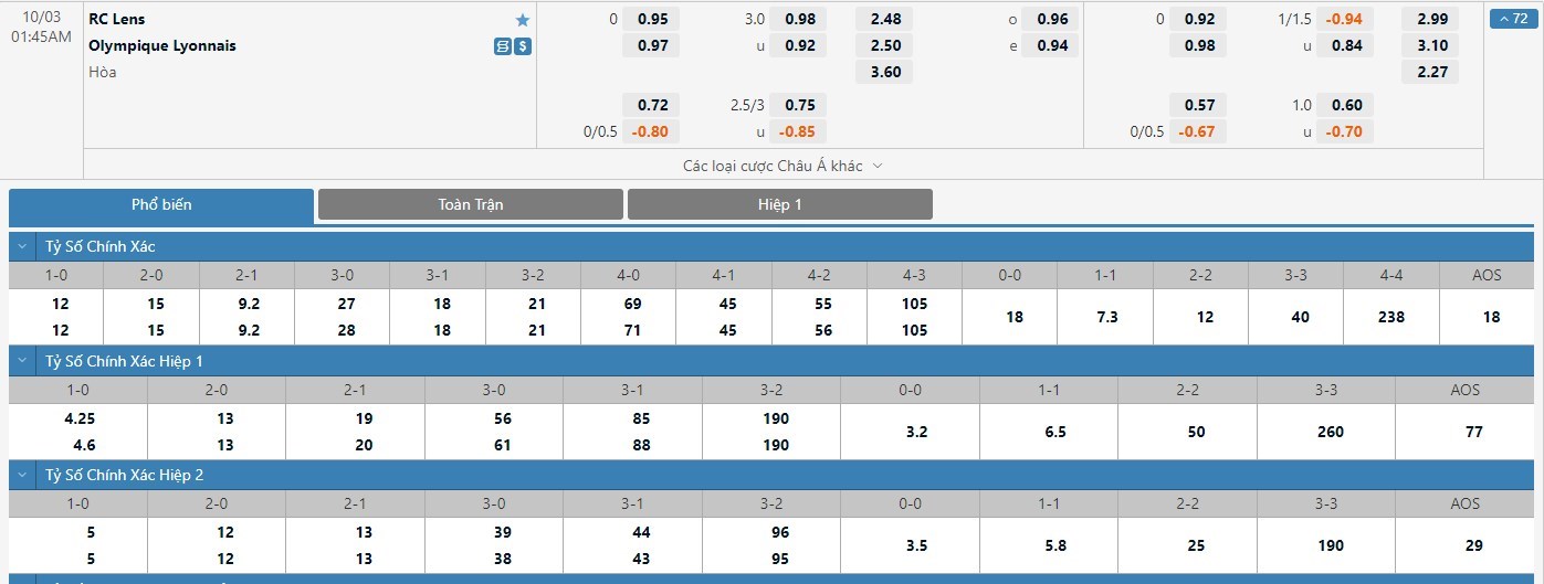 Tỷ lệ kèo cá cược bóng đá trực tuyến trận Lens vs Olympique Lyonnais