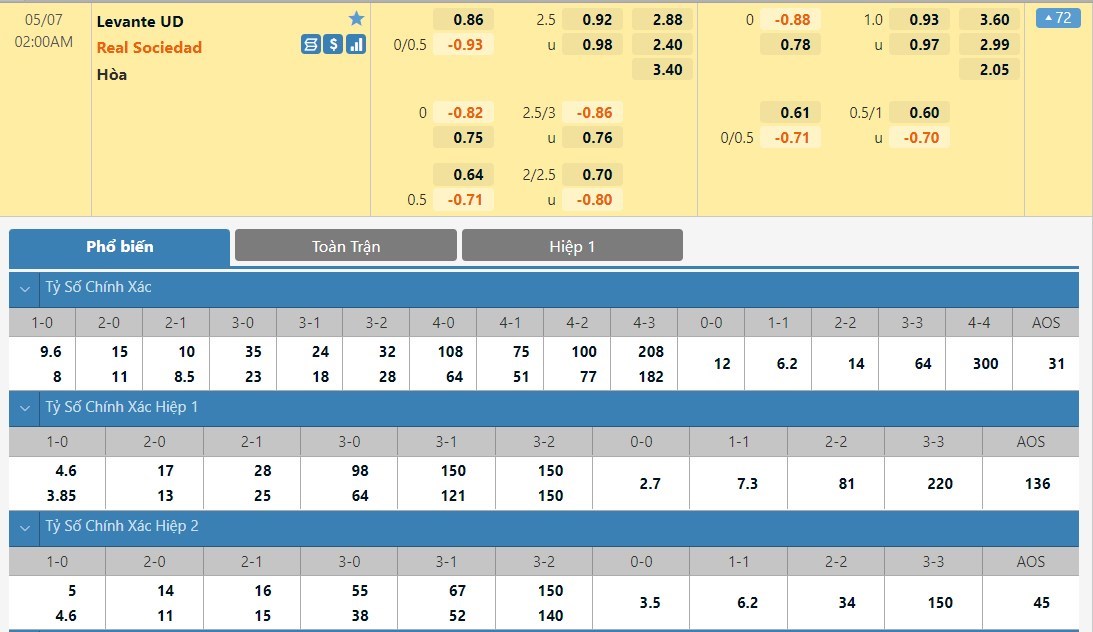 Tỷ lệ kèo cá cược bóng đá trận Levante vs Real Sociedad