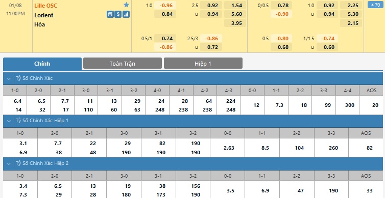 Xem tỷ lệ kèo cá cược bóng đá trực tuyến Lille vs Lorient