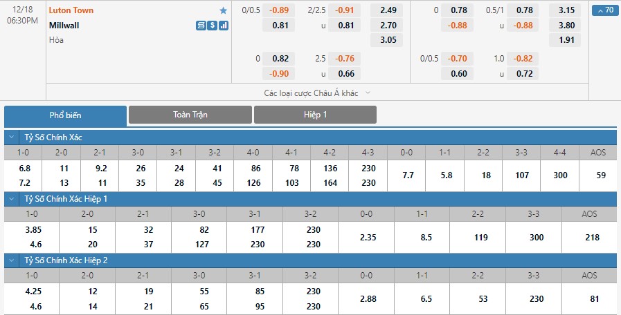 Xem tỷ lệ kèo cá cược bóng đá trực tuyến Luton Town vs Millwall