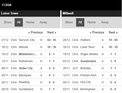 Thống kê phong độ Luton Town vs Millwall