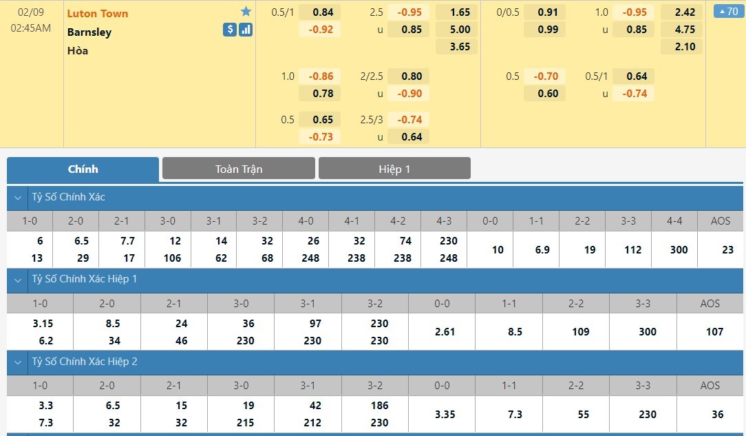 Tỷ lệ kèo cá cược bóng đá trận Luton vs Barnsley