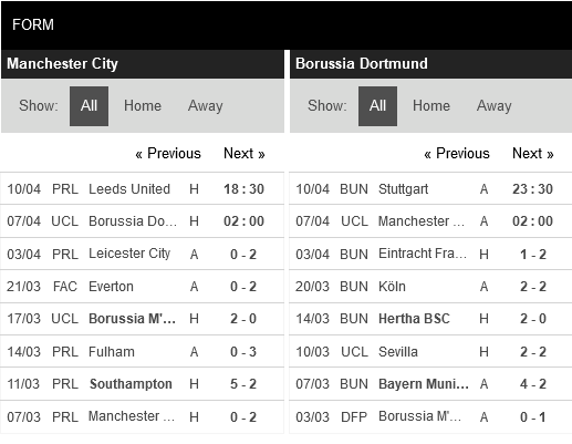 Thống kê phong độ Manchester City vs Borussia Dortmund