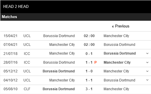 Thống kê đối đầu Manchester City vs Borussia Dortmund