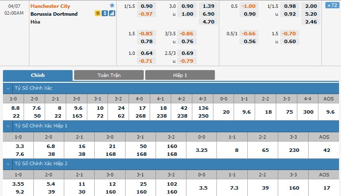 Xem tỉ lệ kèo cá cược bóng đá trực tuyến Manchester City vs Borussia Dortmund