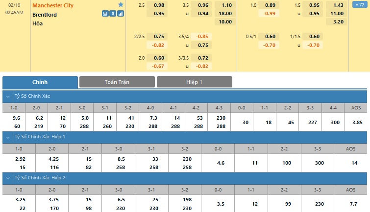 Xem tỷ lệ kèo cá cược bóng đá trực tuyến Manchester City vs Brentford