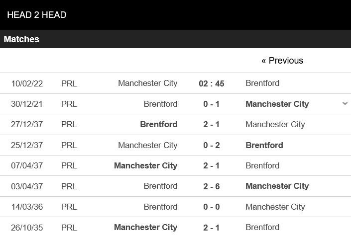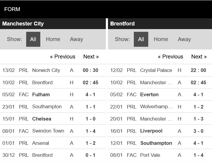 Thống kê đối đầu Manchester City vs Brentford
