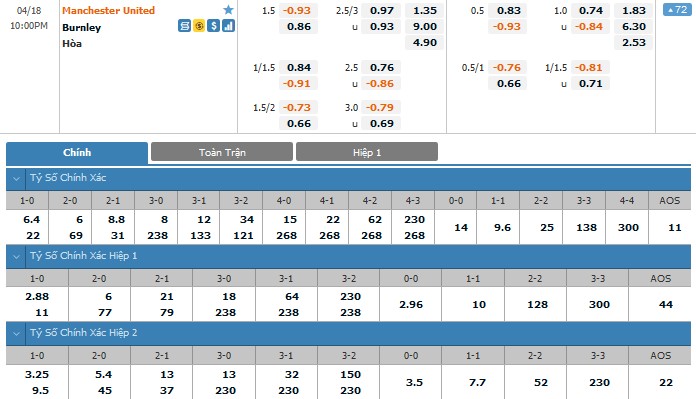 Xem tỉ lệ kèo cá cược bóng đá trực tuyến Manchester United vs Burnley