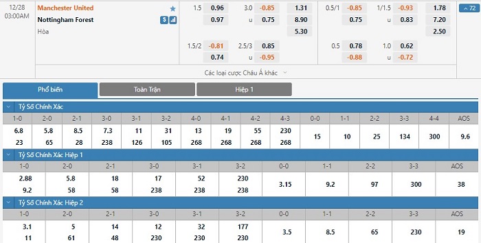 Xem tỷ lệ kèo cá cược bóng đá trực tuyến Manchester United vs Nottingham