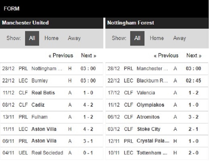 Thống kê phong độ Manchester United vs Nottingham