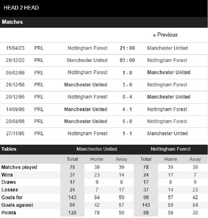 Thống kê đối đầu Manchester United vs Nottingham