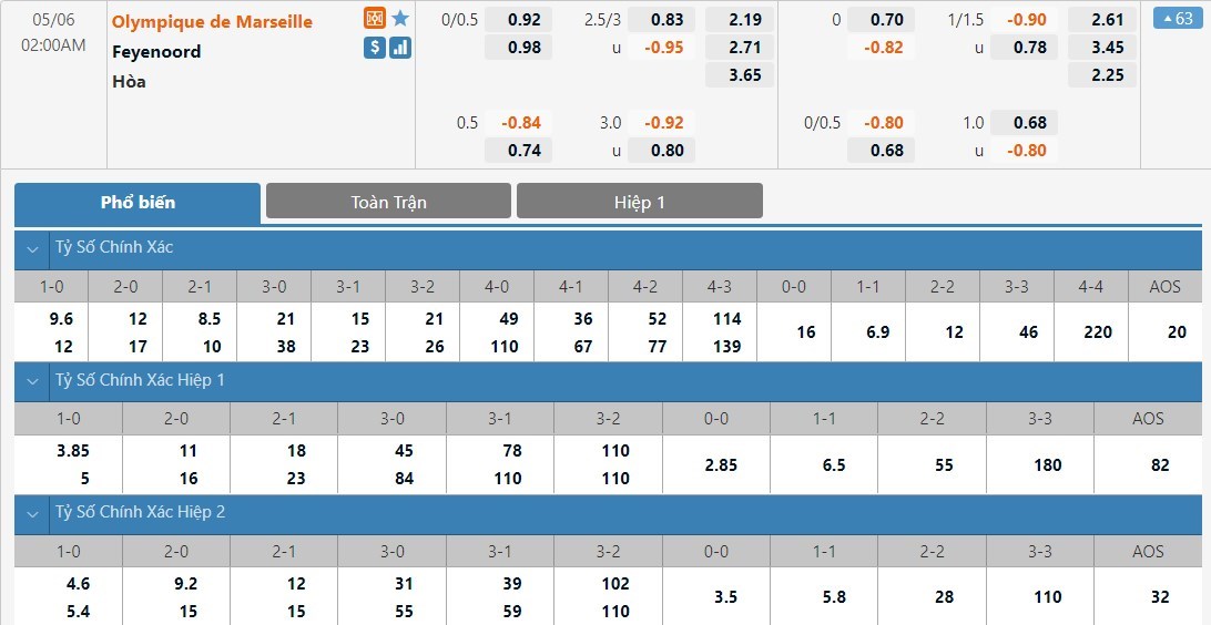 Tỷ lệ kèo cá cược bóng đá trận Marseille vs Feyenoord
