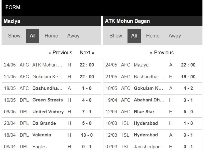 Thống kê phong độ Maziya vs ATK Mohun Bagan FC