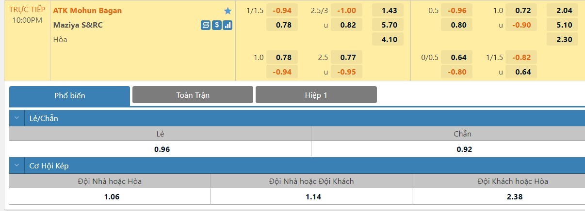 Xem tỷ lệ kèo cá cược bóng đá trực tuyến Maziya vs ATK Mohun Bagan FC