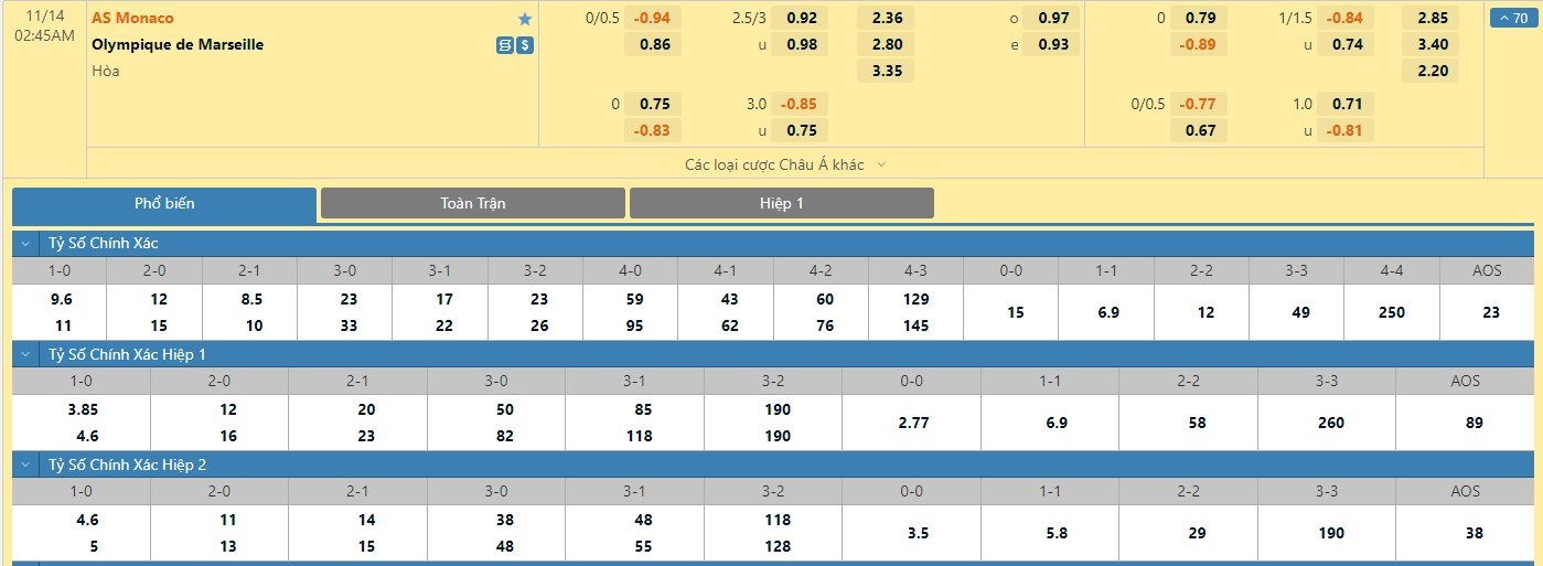 Xem tỷ lệ kèo cá cược bóng đá trực tuyến Monaco vs Marseille