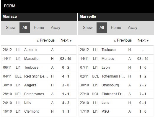 Thống kê phong độ Monaco vs Marseille