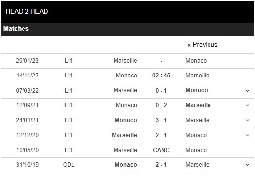 Thống kê đối đầu Monaco vs Marseille