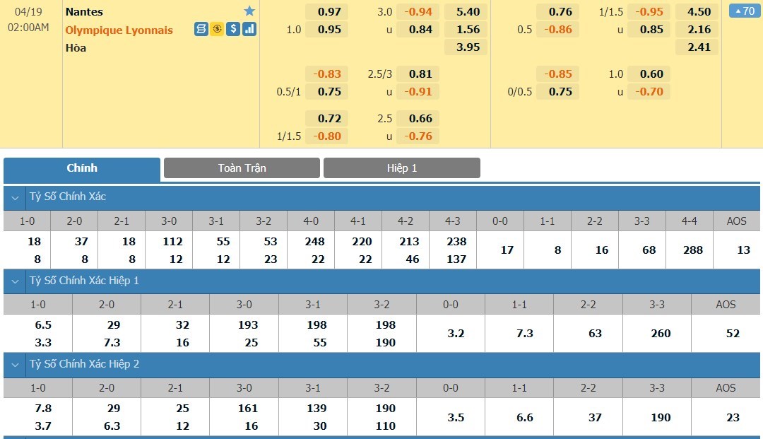 Tỷ lệ kèo cá cược bóng đá trực tuyến trận Nantes vs Olympique Lyonnais