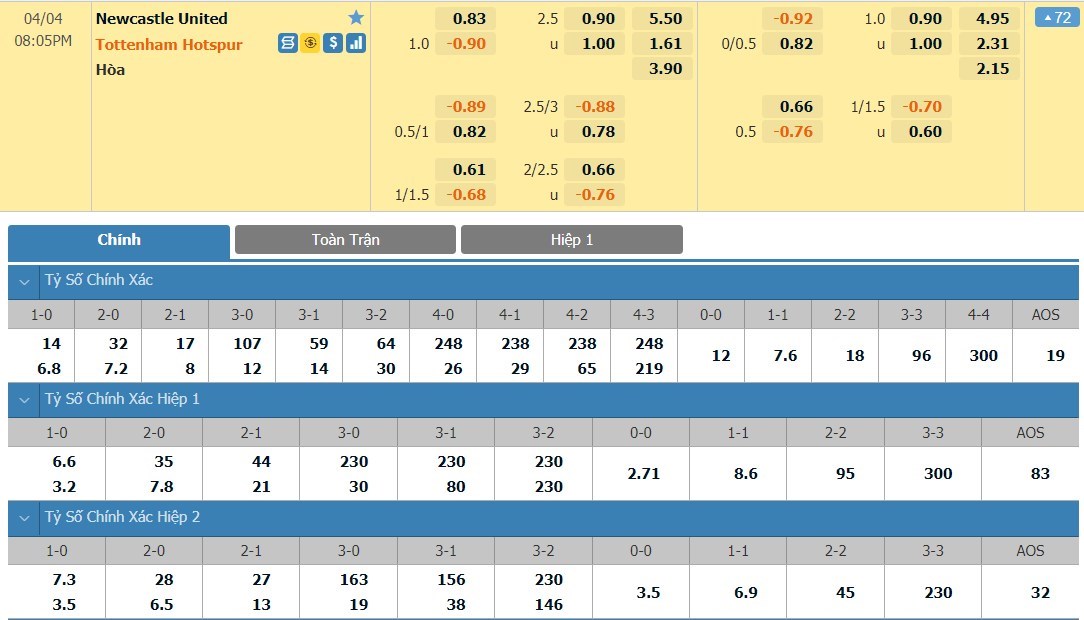 Tỷ lệ kèo cá cược bóng đá trực tuyến trận Newcastle United vs Tottenham