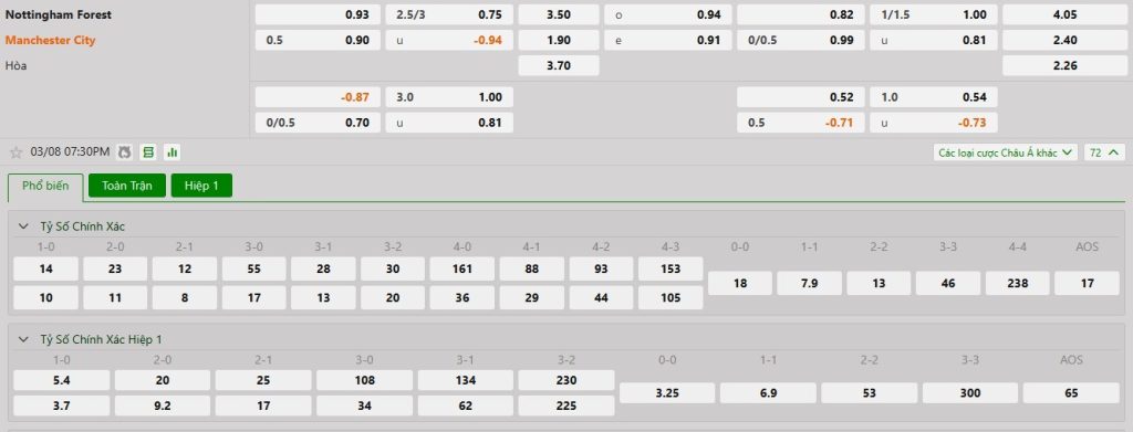 Xem tỷ lệ kèo cá cược bóng đá trực tuyến Nottingham vs Manchester City
