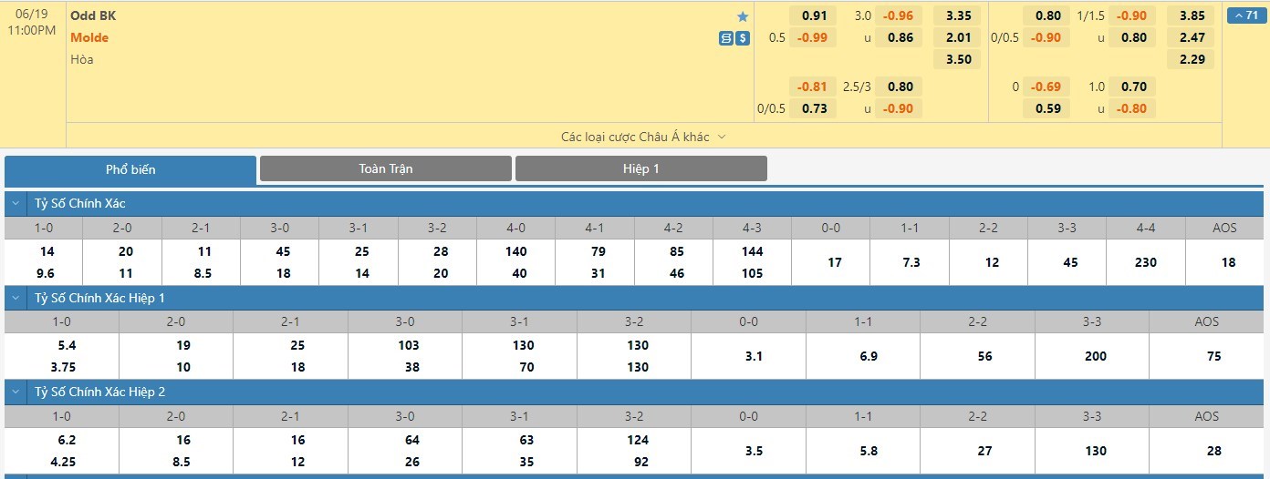 Tỷ lệ kèo cá cược bóng đá trận Odd BK vs Molde