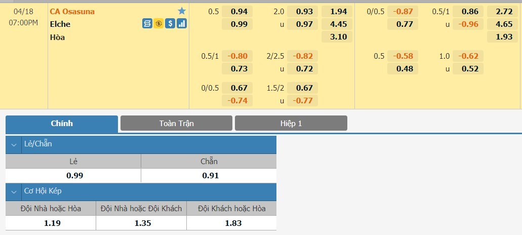Tỷ lệ kèo cá cược bóng đá trận Osasuna vs Elche