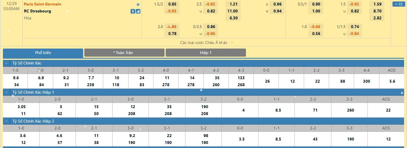 Xem tỷ lệ kèo cá cược bóng đá trực tuyến Paris Saint-Germain vs Strasbourg