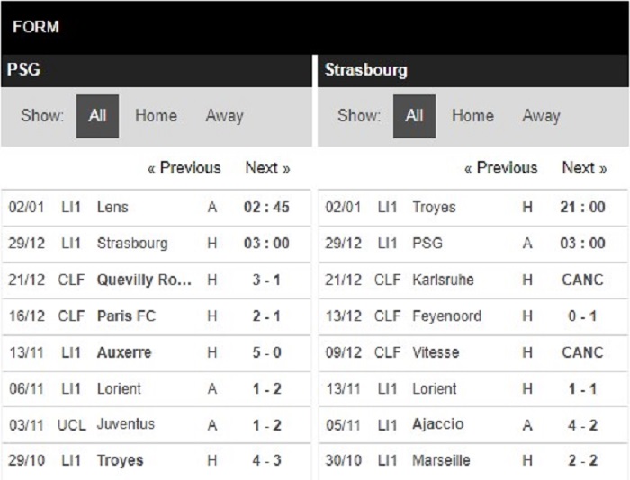 Thống kê phong độ Paris Saint-Germain vs Strasbourg