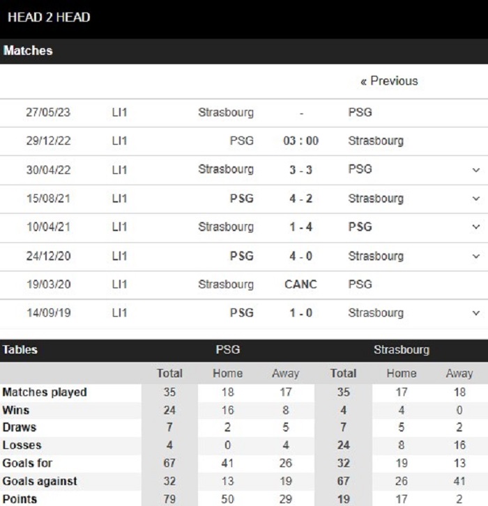 Thống kê đối đầu Paris Saint-Germain vs Strasbourg
