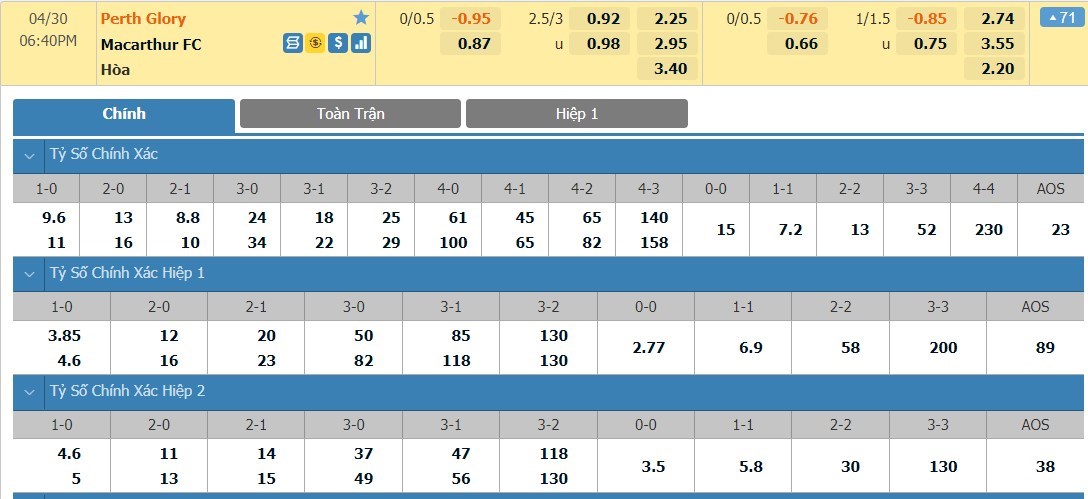 Tỷ lệ kèo cá cược bóng đá trực tuyến trận Perth Glory vs Macarthur FC