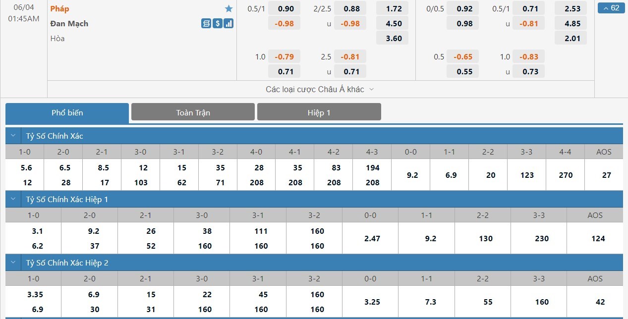 Tỷ lệ kèo cá cược bóng đá trực tuyến trận Pháp vs Đan Mạch