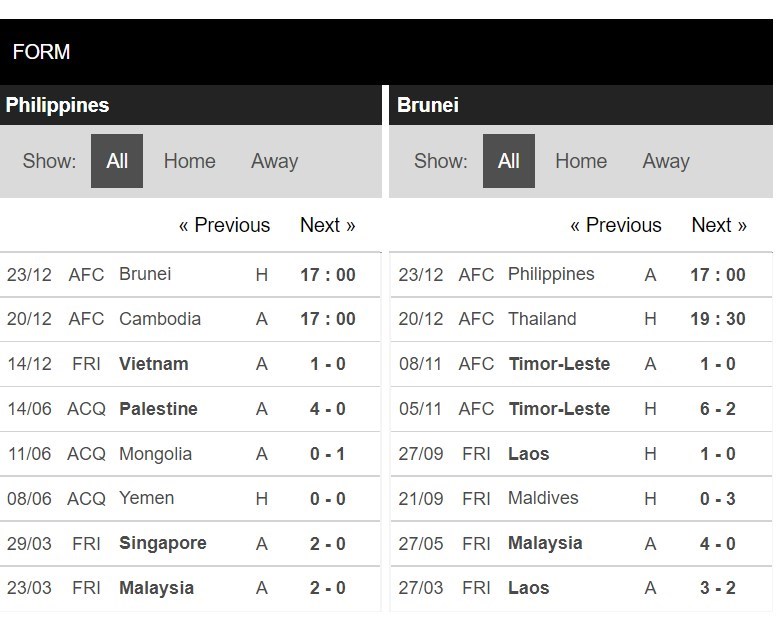 Thống kê phong độ Philippines vs Brunei