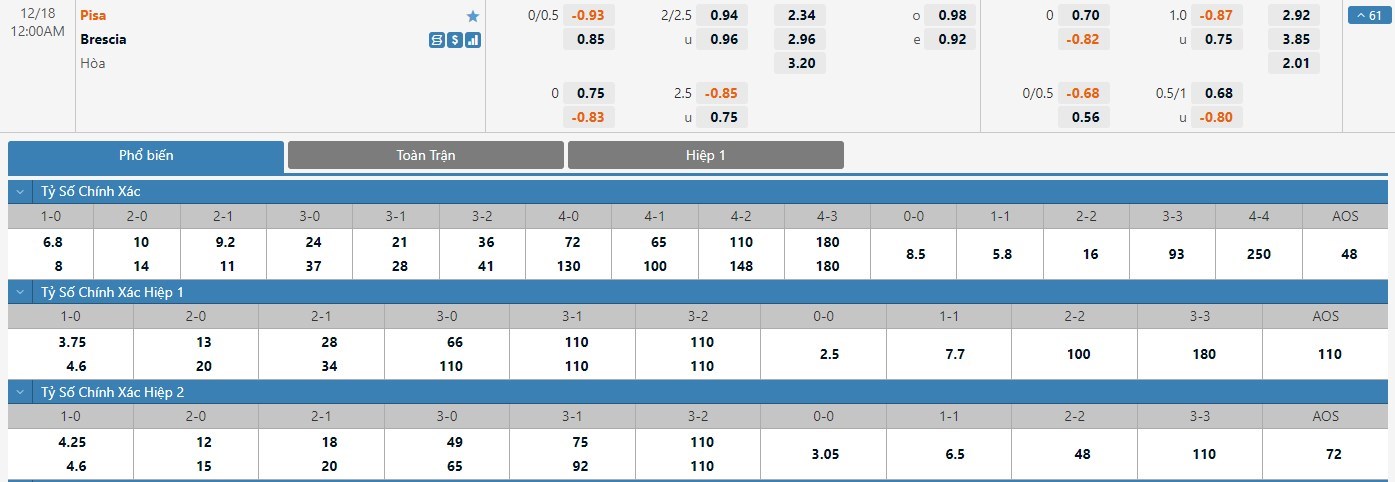Tỷ lệ kèo cá cược bóng đá trận Pisa vs Brescia