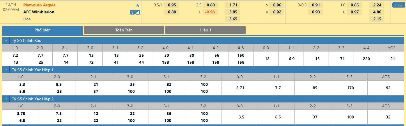 Tỷ lệ kèo cá cược bóng đá trận Plymouth vs AFC Wimbledon