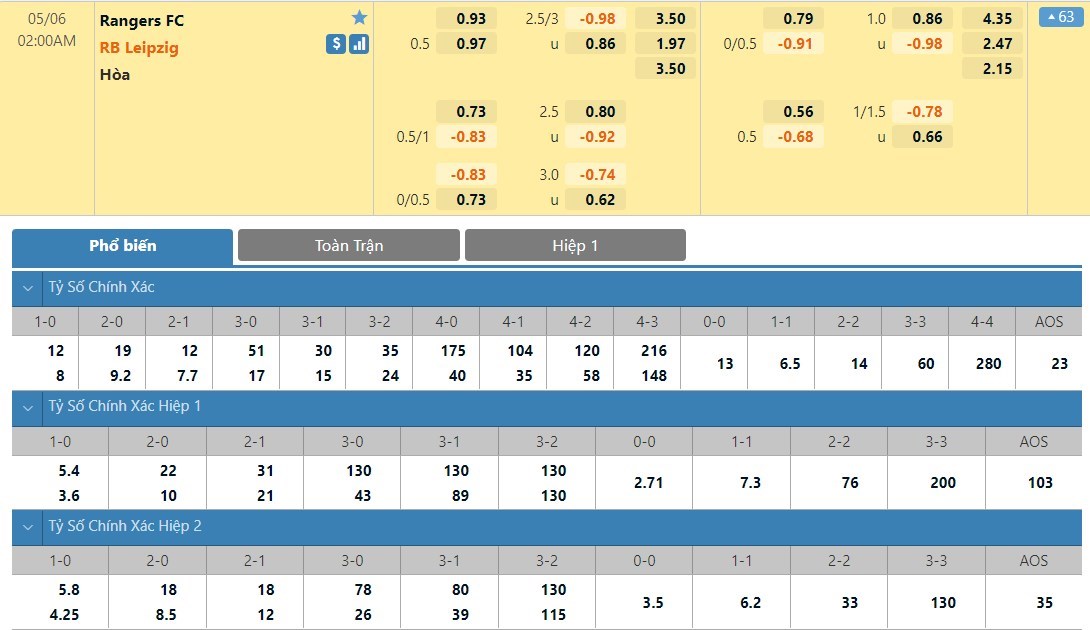 Tỷ lệ kèo cá cược bóng đá trực tuyến trận Rangers FC vs RB Leipzig