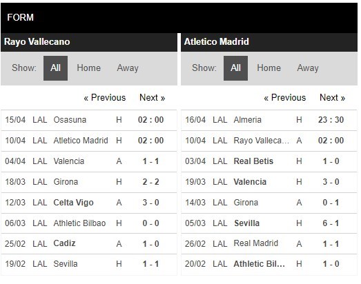 Thống kê phong độ Rayo Vallecano vs Atletico Madrid