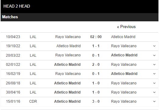 Thống kê đối đầu Rayo Vallecano vs Atletico Madrid