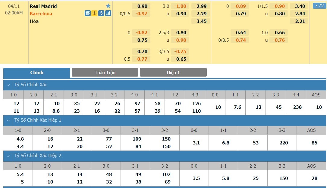 Tỷ lệ kèo cá cược bóng đá trực tuyến trận Real Madrid vs Barcelona