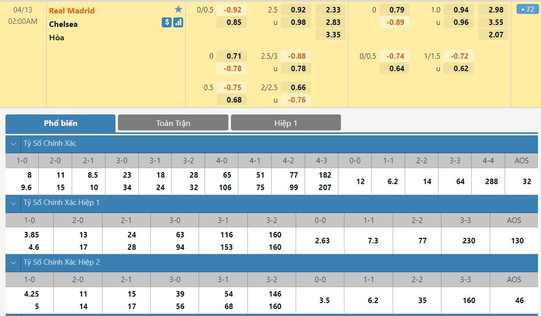 Tỷ lệ kèo cá cược bóng đá trực tuyến trận Real Madrid vs Chelsea