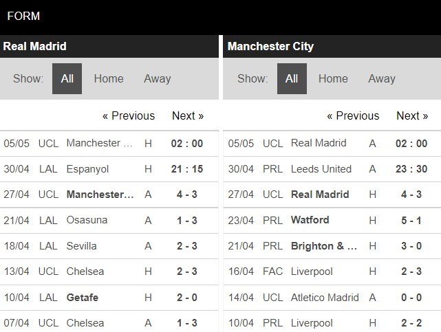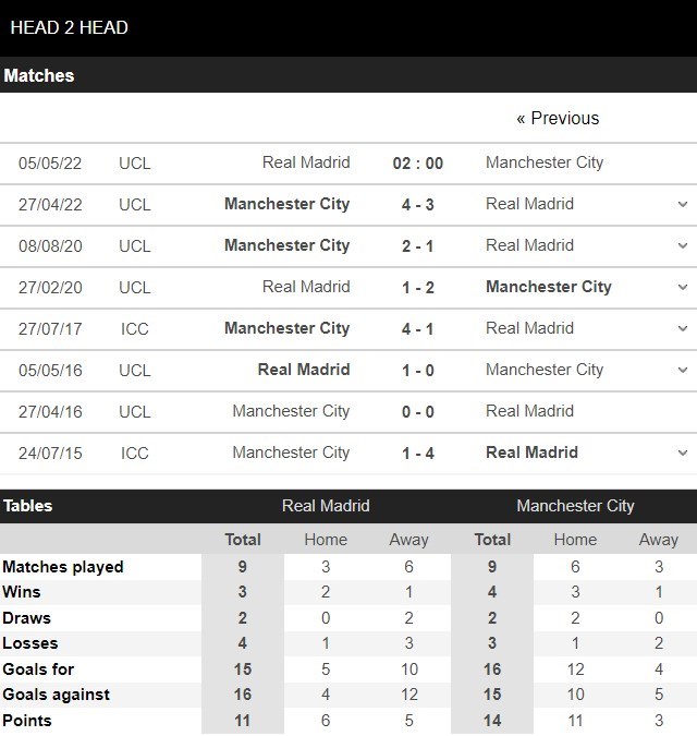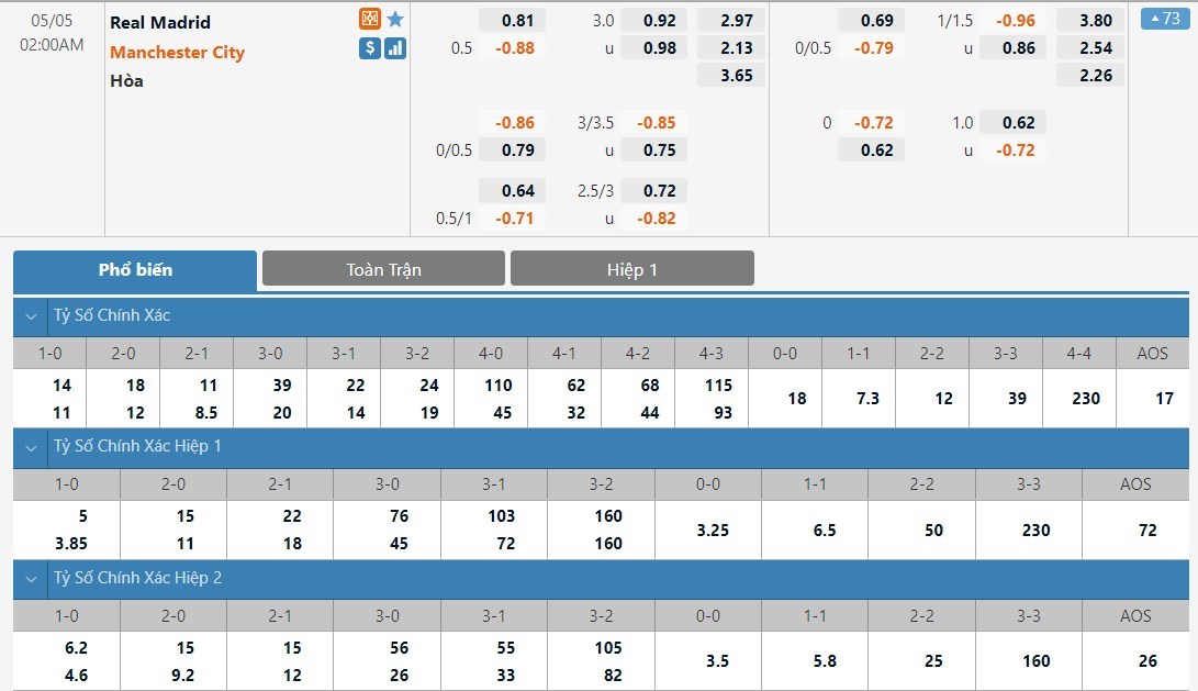 Xem tỷ lệ kèo cá cược bóng đá trực tuyến Real Madrid vs Manchester City