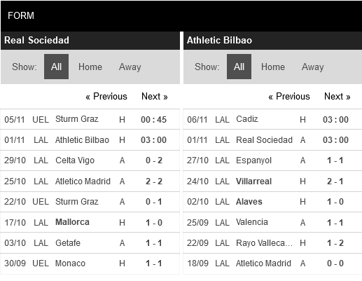 Thống kê phong độ Real Sociedad vs Athletic Bilbao