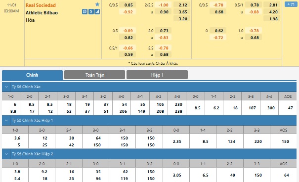 Xem tỉ lệ kèo cá cược bóng đá trực tuyến Real Sociedad vs Athletic Bilbao