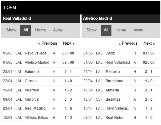 Thống kê phong độ Real Valladolid vs Atletico Madrid