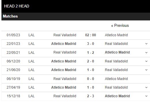 Thống kê đối đầu Real Valladolid vs Atletico Madrid